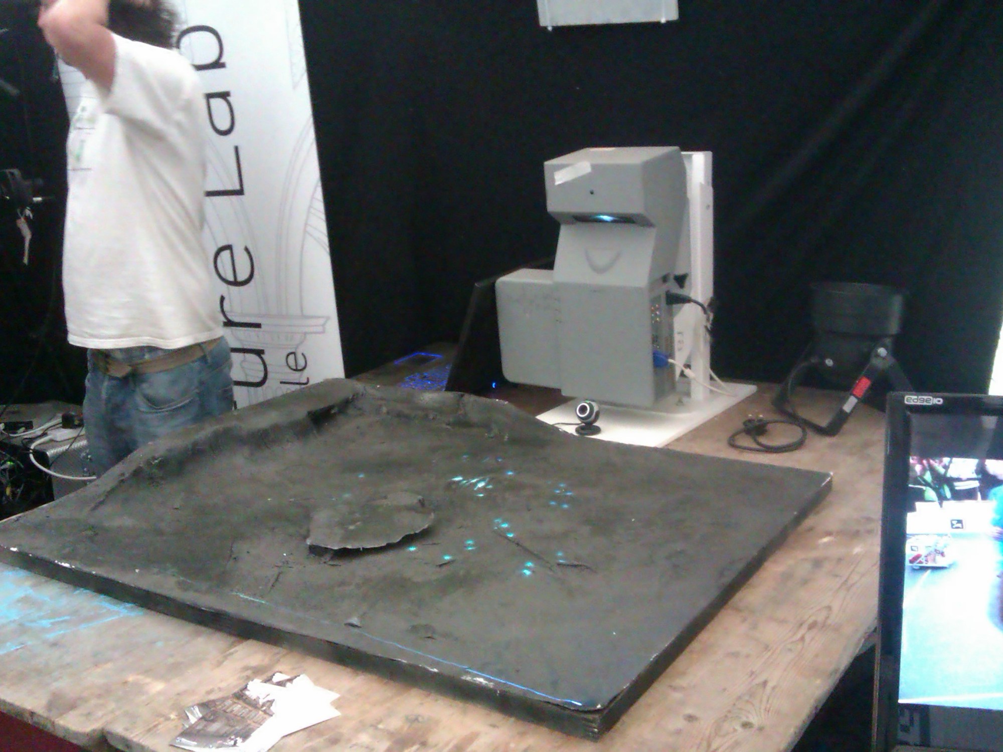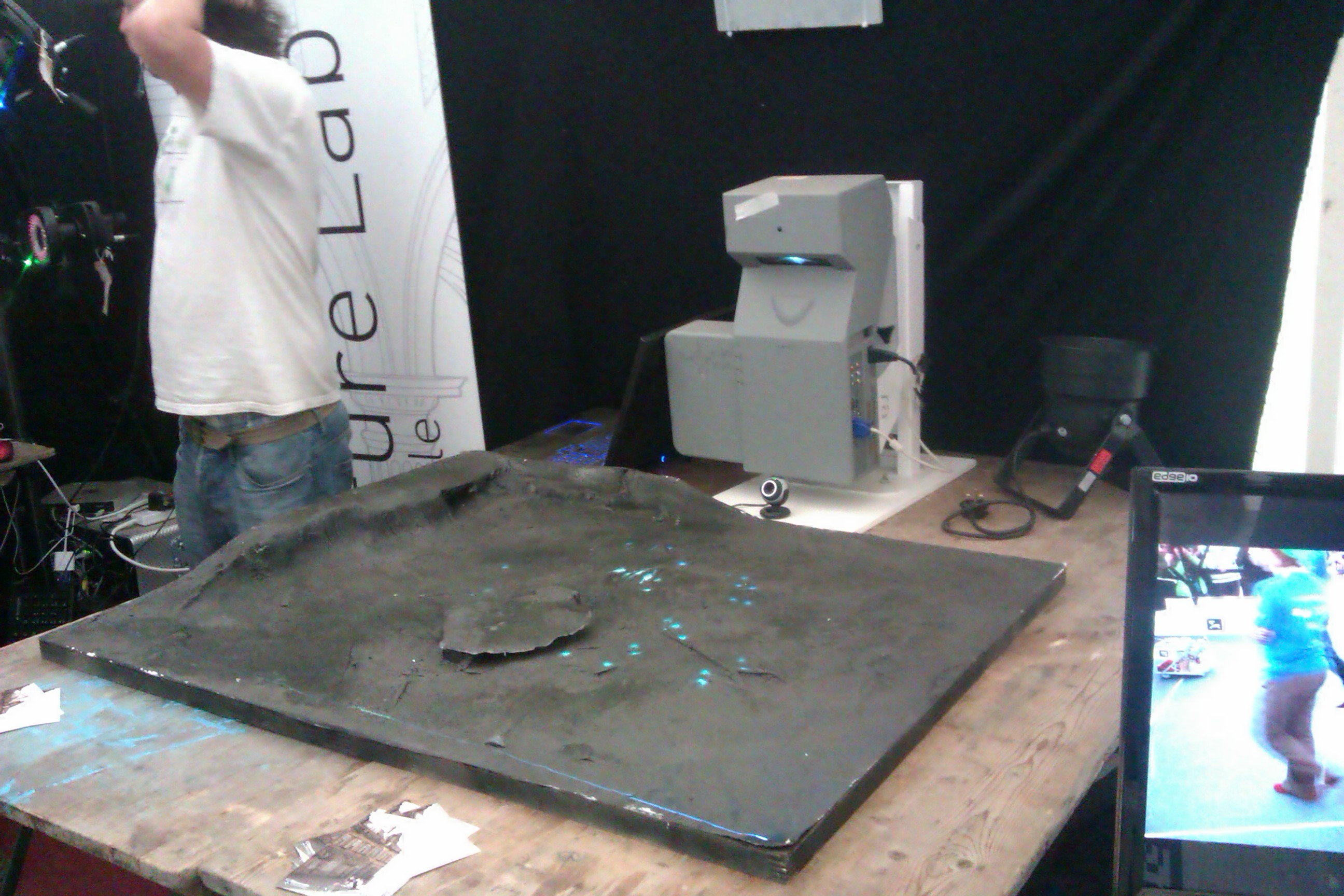 I built a shy artwork: a video-mapped real-time eco-system in which bugs scuttled around, eating vegetation and predating on each other. The twist was that the work also featured basic face identification: look directly at it and everything would hide. Cue visitors sneaking glances from the corners of their eyes, from behind their hands and peeking over the edge of the table.