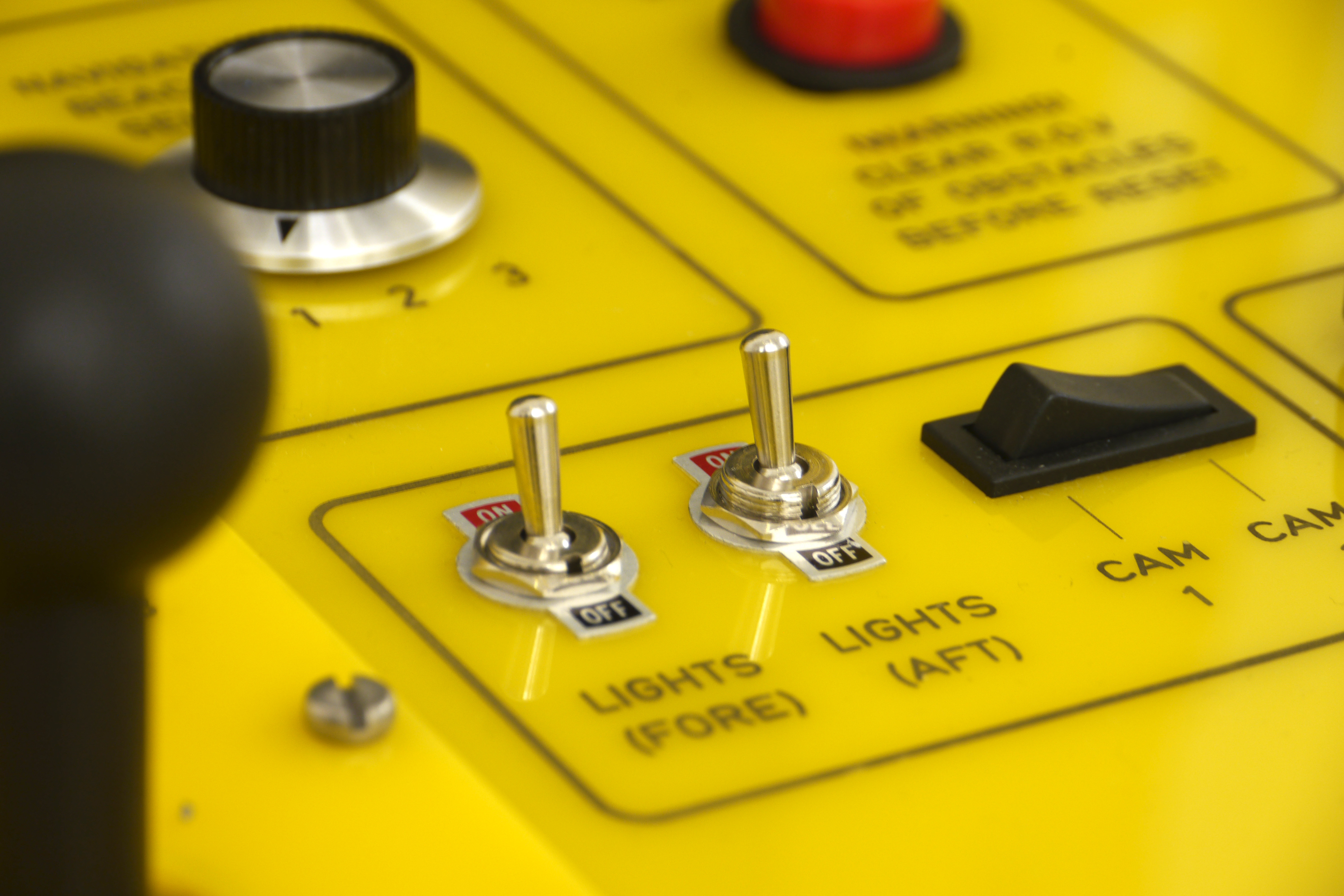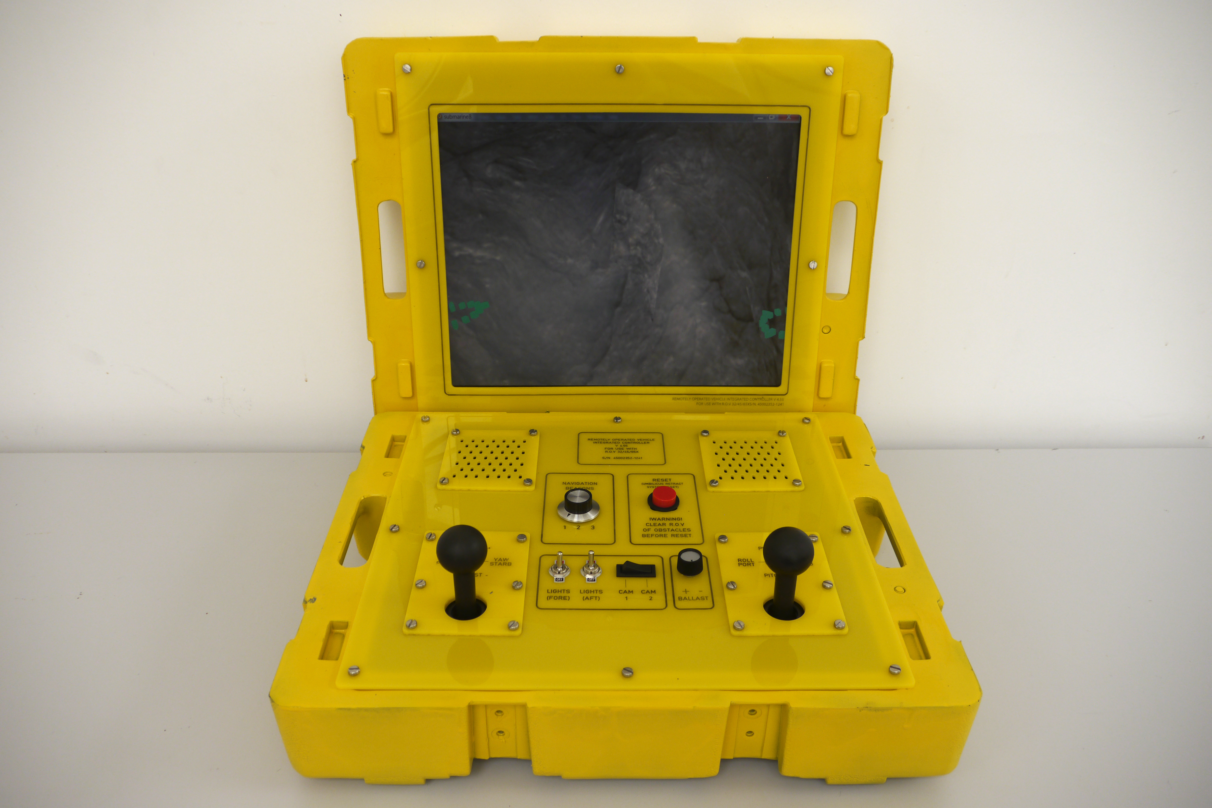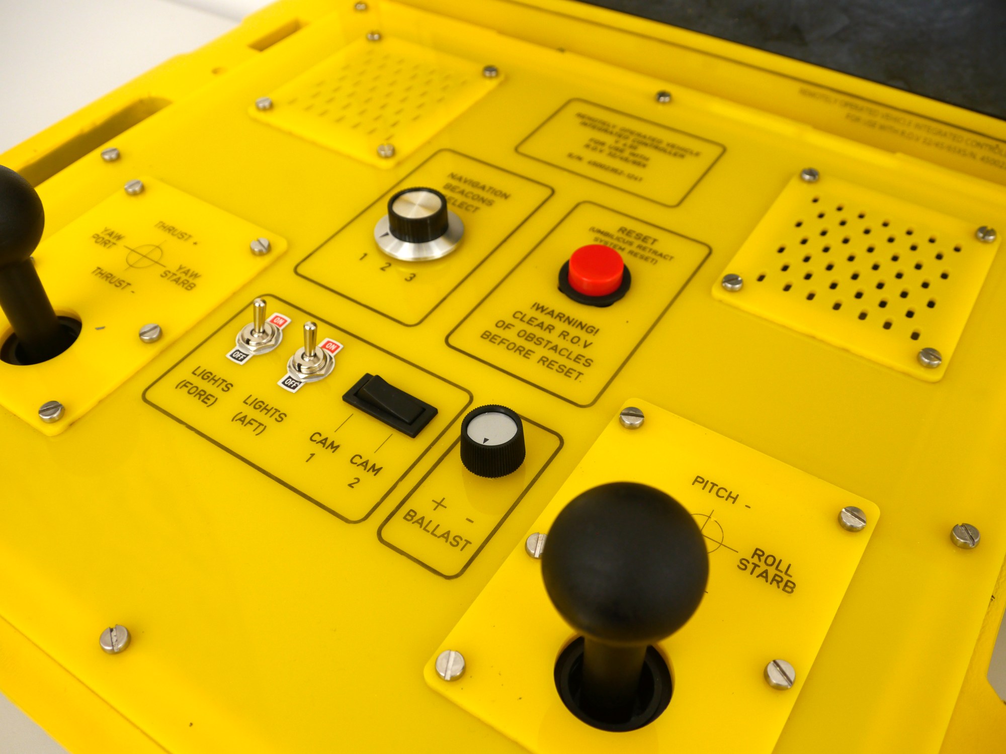 R.O.V. is a narrative controller exploring the epistemology of exploration, discovery and cartography. Encased in a rugged hazard-yellow field box the piece appears to be a controller for a remote control submersible. Twin joysticks, switches and knobs allow the user to explore an underwater landscape, displayed on a monitor embedded in the field box. This environment, rendered in 3D graphics, is based on Kampanakis’ 1891 map of Atlantis: itself an attempt to render credible a myth: a centuries-old string of Chinese whispers emanating from a chance remark in Plato. The piece represents both an attempt to use the aesthetic of an interface as a narrative device and to explore layers of truth, representation and misconception.
