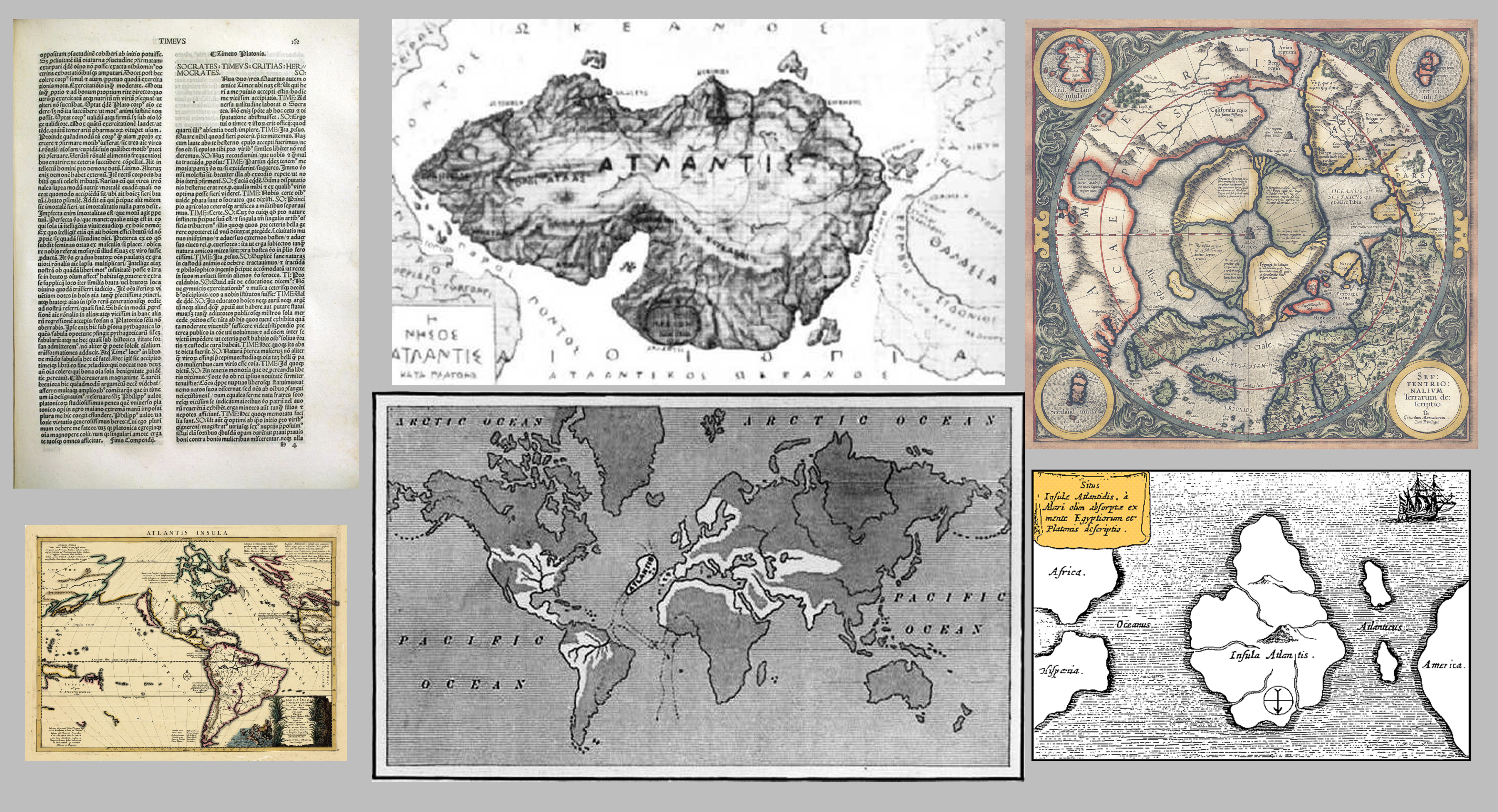 Various forms of pseudo-cartography. Clockwise from Top Left: Plato (circa 360 BC), Kampanakis (1891), Mercator (1595), Donnelly (1882), Sanson (1661).
